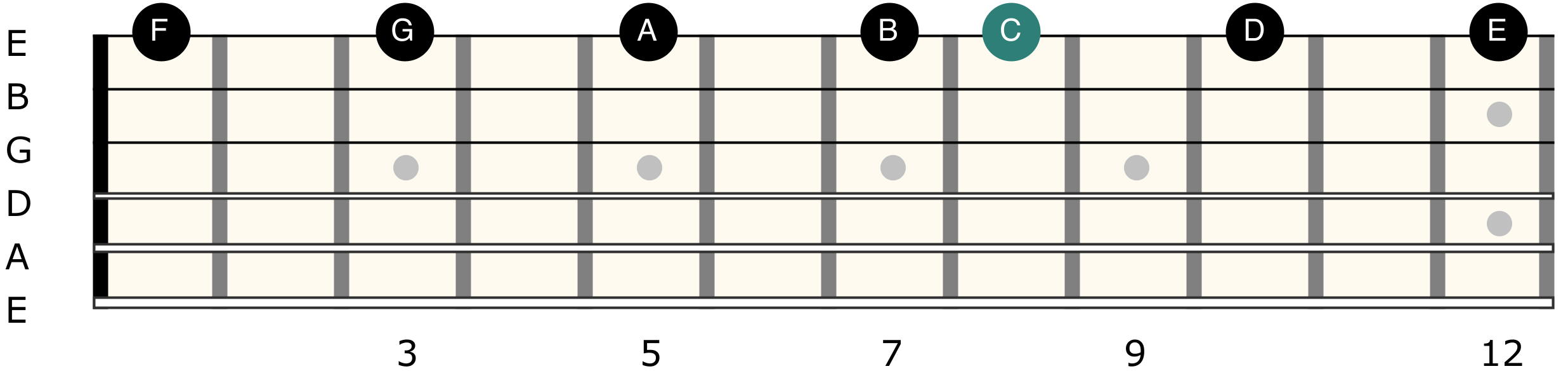The 1st string (high E) mirrors the 6th string, making it a great place to reinforce what you’ve already learned. Use the diagram below as a visual map of the natural notes along the string. Don’t worry about memorizing everything right away — get familiar with where the notes live, then move on to the quiz to start building speed.
